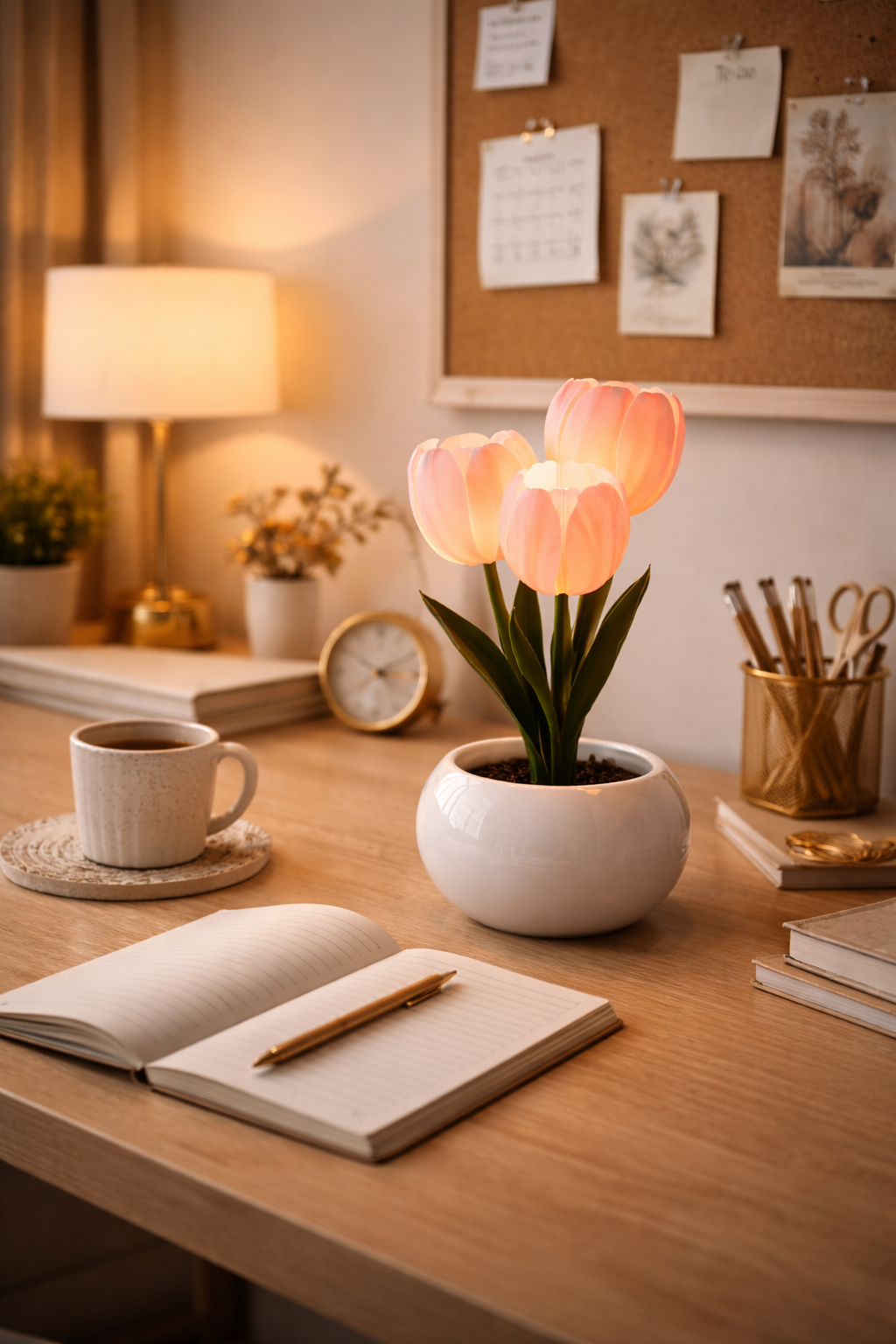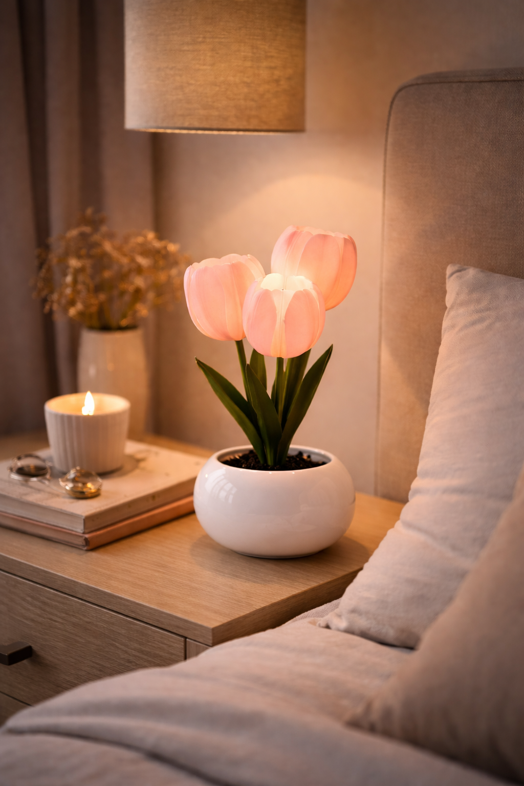 Crea un ambiente romántico y acogedor con esta lámpara LED de tulipanes. Su luz cálida aporta elegancia y calma a dormitorios y salas, sin calentarse y con bajo consumo energético. Ideal como decoración o regalo especial que transforma cualquier rincón al instante 🌷✨